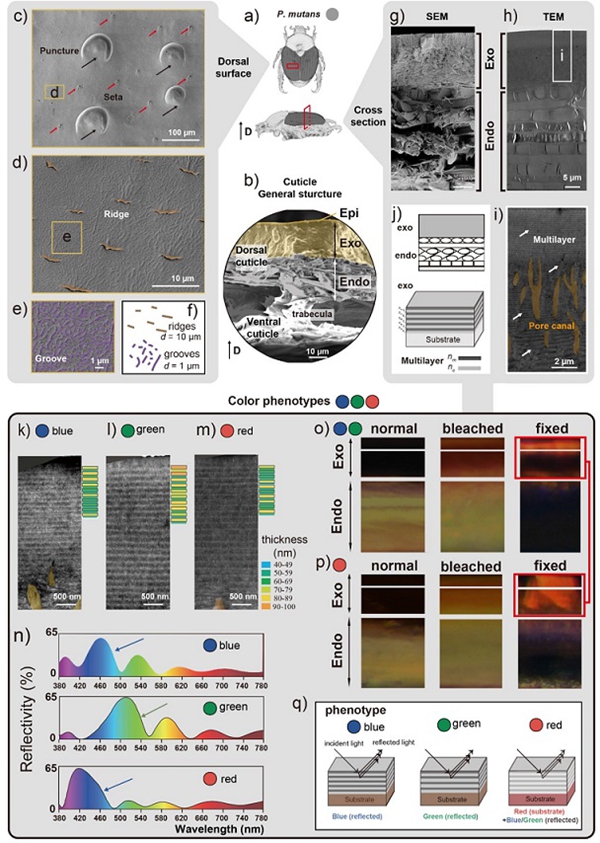 为了揭示其颜色形成机制,研究团队利用光学特性、化学特征检测、扫描电镜和透射电镜技术,获得了不同色型的表面和截面超微特征。结合物理仿真模拟计算,研究发现该物种的颜色形成不单纯由物理色或化学色来解释,而是代表了一个罕见特殊案例——其颜色是由色素与表皮结构组成的复合结构产生,并非仅仅由结构色决定(通常认为丽金龟是物理色的典型代表)。与此同时,不同色型的主要机制亦存在差异。具体而言,在超微观层面上,其表皮的多层膜结构、黑色素的分布与排列等,共同作用于颜色的形成。蓝色型和绿色型由结构色主导:外表皮存在 25 层深浅交替排列的亚层,通过光的多层干涉呈现出蓝、绿两种物理色。其中,绿色型的浅色层更厚,导致反射光波长更长,峰值为531-561nm,而蓝色型的浅色层较薄,反射峰值为445-461nm。红色型则以化学色素色为主导:表皮的黑色素类似物直接吸收特定波长的光,呈现红色,其表皮深浅亚层边界较模糊,物理色的效应较弱。以往研究中物理色与化学色研究往往是独立进行验证的,该研究创新性地解析了甲虫物理色和化学色协同成色机制,丰富了颜色多态性与物种形成理论。