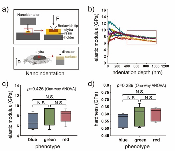 为了理解不同色型的生态适应进化机制,研究对544个地理分布信息进行分析,发现其不同色型呈现一定的地理分布规律。不同色型分布与纬度和海拔相关,其中蓝色型在我国北方占优势,其余色型则主要分布于南方。科研人员通过分析19个气候因子和全年太阳辐射值与色型分布的关系,发现温度与色型分布最相关。为进一步探明不同色型的生态学意义,研究分别比较了不同色型个体力学性能和热调节能力。与以往研究不同,在本研究案例中,尽管表皮的超微观结构和化学组成并不相同,但纳米压痕仪测试表明各色型间体壁的力学性能无显著性差异。对于热调节功能假说,研究团队通过控制实验设计,证实了色型之间的热调节能力存在差异,其中蓝色型升温相对更快,有助于昆虫在低温环境中更快提升体温,达到其飞行、取食所需的最低能量。这也与蓝色个体更能适应北方或高海拔地区的现象吻合。