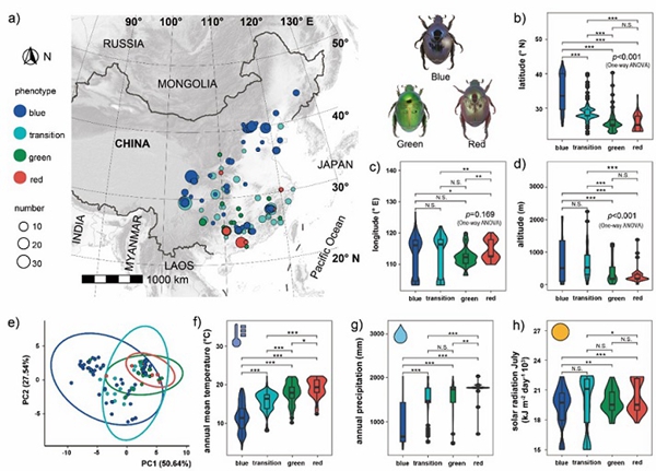 相关研究成果以Structural background of intraspecific color polymorphism and the driver of geographic patterns in a shining leaf chafer为题,发表在Frontiers in Zoology上。研究工作得到国家自然科学基金、国家重点研发计划、中国科学院相关项目等的支持。