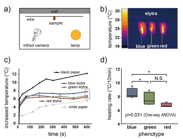 研究揭示蓝色甲虫升温更快的物理化学机制与生态适应进化新理论。颜色多态性现象在生物中广泛存在,其物理和化学机制复杂,往往与增强生态适应力和促进物种分化相关。有关生物颜色的功能,通常由伪装、体温调节、机械抵抗、紫外线防护等假说进行解释。然而,颜色的形成是一个复杂的物理、化学过程。过去关于种内颜色多态性的研究多集中在现象描述、假说讨论、分子机制探讨等,忽视了颜色形成的物理和化学机制基础,因而阻碍了功能假说的论证设计,进而误解其生态功能和演化驱动因素。