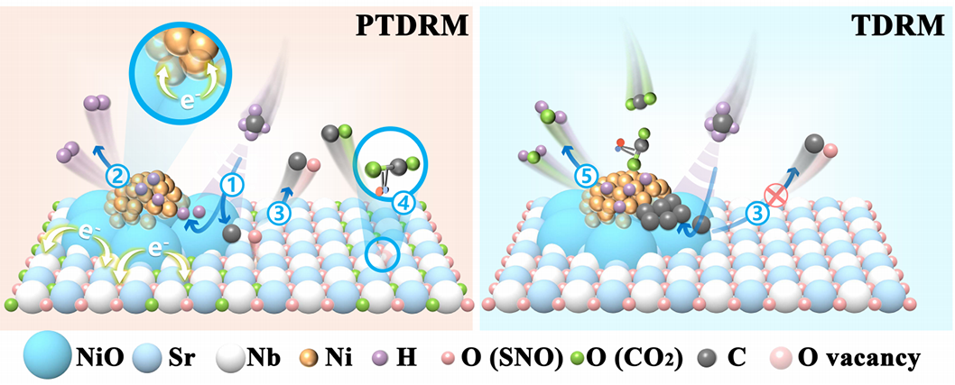 甲烷干重整反应(DRM)可用于将温室气体甲烷(CH4)和二氧化碳(CO2)转化为合成气(氢气和一氧化碳),为碳资源高值化利用提供了极具前景的技术路径。然而,缺乏兼具高活性与长寿命的DRM催化剂限制着该领域的发展。PTDRM可在较低温度下驱动DRM反应,但目前仍存在实际光利用率低、合成气生成速率难以媲美热催化、副反应难以有效抑制等问题。