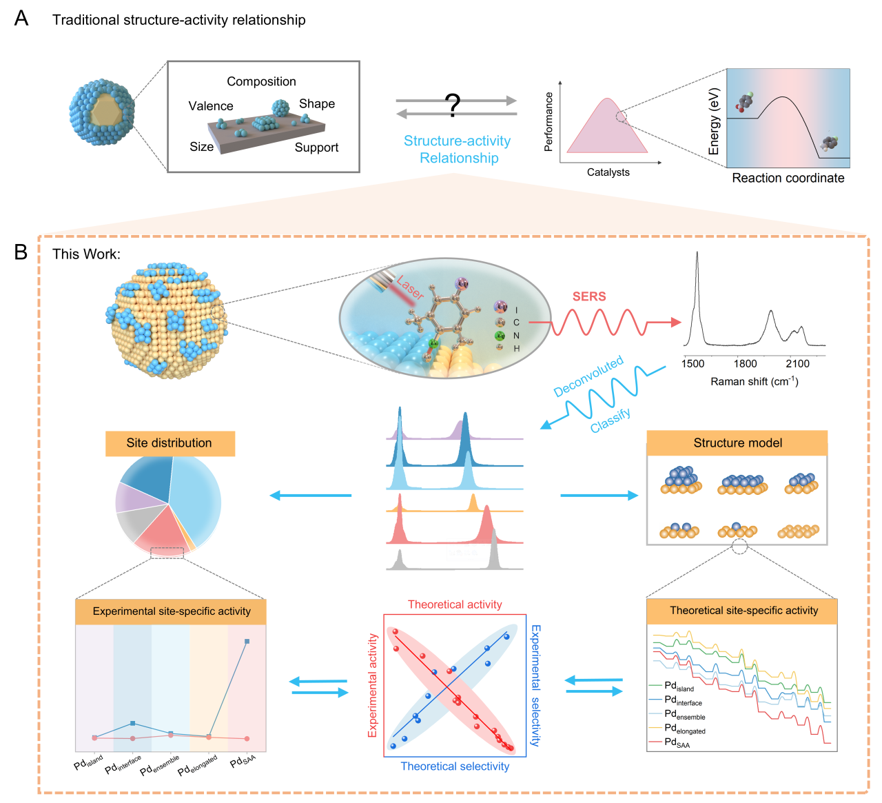 中国科学院生态环境研究中心刘睿团队取得突破,他们发展了基于表面增强拉曼光谱(SERS)的活性位点全景图谱技术,实现对钯(Pd)催化剂表面所有活性位点的精准分类与定量,揭示微观位点结构与宏观性能的定量构效关系。这项研究为催化剂装上原子尺眼睛,并为原子级精密催化剂设计提供了普适性方法论。