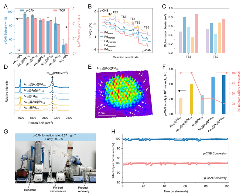 催化剂性能的关键维度不仅在于本征活性,更在于化学选择性。该研究发展的活性位点定量方法突破性实现选择性预测与高效催化剂理性设计:针对对氯硝基苯(医药化工关键中间体)选择性加氢制备对氯苯胺体系,通过原位拉曼光谱解析锁定PdSAA为高选择性转化的活性中心。据此定向构筑富含PdSAA位点的Au3.5@Ag@Pd1/8催化剂,结合固定床微反应器在连续100小时流动反应中实现>99%转化率与>99%选择性的工业级性能(图4)。该成果证实基于表面增强拉曼光谱(SERS)的位点定量技术可为原子精度催化剂设计提供普适性指导。