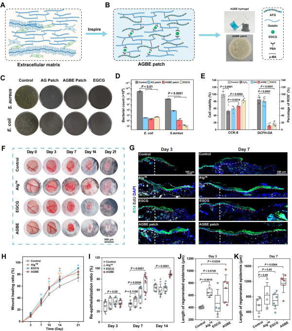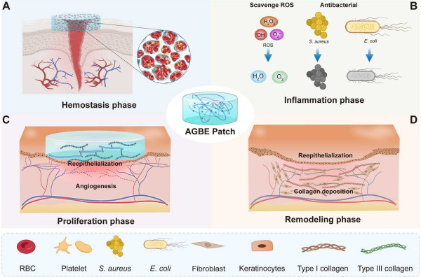 在皮肤伤口愈合过程中,成纤维细胞以及角质形成细胞等依赖细胞外基质(ECM)进行增殖与迁移。ECM由蛋白聚糖与纤维蛋白等大分子结构交织形成。受此启发,中国科学院昆明植物研究所吴明一研究团队将具有相似结构的蜗牛糖胺聚糖与明胶共价交联组成了一种类ECM的凝胶网络,将天然植物多酚EGCG以硼酸酯键络合负载进凝胶中,制备了一种兼具抗菌、抗氧化、抗炎以及促进组织再生的凝胶贴片(AGBE patch)。
