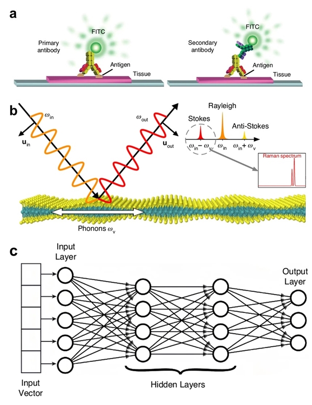 图2. 结合(a)荧光标记、(b)拉曼技术和(c)人工智能的主动光学分选技术原理