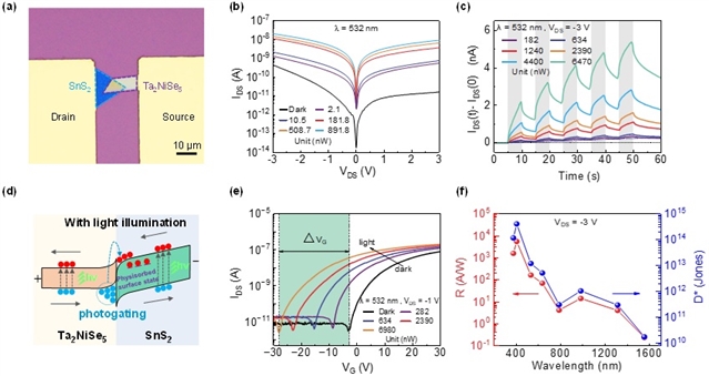 图2. Ta2NiSe5/SnS2异质结的光电探测性能表征。