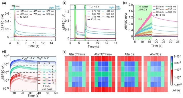 研究团队基于光增益理论(G=τ/tL,其中τ为载流子寿命,tL为渡越时间),通过构建Ta2NiSe5/SnS2异质结结构,创新性地将气体吸附效应与载流子光栅压调控机制相结合,实现了宽谱光电转换效率和非易失性的突破性提升。一方面,硫化锡(SnS2)是一种在气体探测领域广泛应用的二维半导体材料,其表面存在大量本征的硫空位。这些硫空位能够与气体分子结合,从而为突触行为提供足够的缺陷态。另一方面,钽镍硒(Ta2NiSe5)具备直接窄带隙结构,并且这种材料在室温下表现出激子绝缘体的特性,能够有效吸收光子,广泛应用于红外探测。在此基础上,异质结界面形成的II型能带结构,光生电子在反向偏压下通过界面快速迁移,同时界面势垒将空穴限制在Ta2NiSe5层内,形成持续光栅压效应,使电子在通道内实现多循环输运,最终在可见光波段(405 nm)获得5.6×103 A/W的超高响应度,量子效率突破1.7×106%。进一步结合光脉冲调制技术,该器件在375-1310 nm宽谱范围内展现出长时数据保留能力,并成功模拟视网膜细胞的兴奋性突触后电流(EPSC)、双脉冲易化(PPF指数达158%)及短/长时程可塑性动态转换,为多光谱神经形态视觉系统的硬件实现提供了兼具高灵敏度与仿生功能的解决方案。