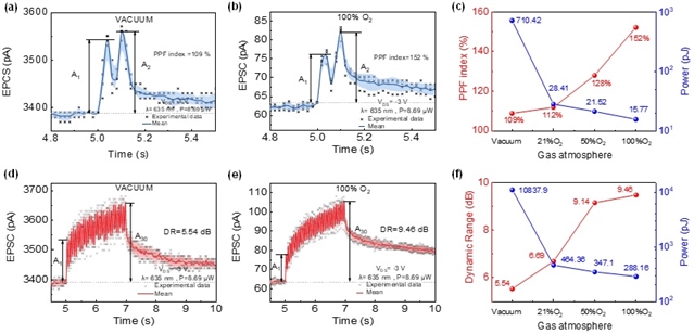 如图3a-b所示,双脉冲易化(PPF)是一种短程突触可塑性增强(STP)现象,指的是神经元细胞接受到连续两个脉冲后,第二个脉冲引起的兴奋性突触后膜电位(EPSC)比第一个脉冲引起的要大得多。PPF行为可以通过PPF index进行衡量,PPF index是影响神经网络对视觉信息处理精度的关键指标,越大的PPF index将会带来越好的处理效果。在气体吸附和持久光电导效应的协同作用下,通过增加气体环境中氧气的浓度,器件的PPF index得到大幅提升,同时完成一次PPF行为的功耗也随之大幅度降低(如图3c所示)。