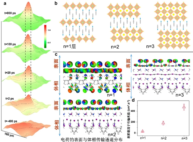 图2. 二维钙钛矿材料表面的光生载流子传输特性。(a)代表性的n=3二维钙钛矿样品中光诱导载流子传输的演化过程。(b)二维卤化物钙钛矿((BA)n(MA)n-1PbnI3n+1)在不同无机层数(n = 1, 2, 3)下的示意结构。(c)三种样品在费米能级处Г点的电荷传输本征态示意图,颜色强度表示传输通道从表面到体相的分布情况。(d)钙钛矿层数从1到3的表面载流子扩散系数估算值。