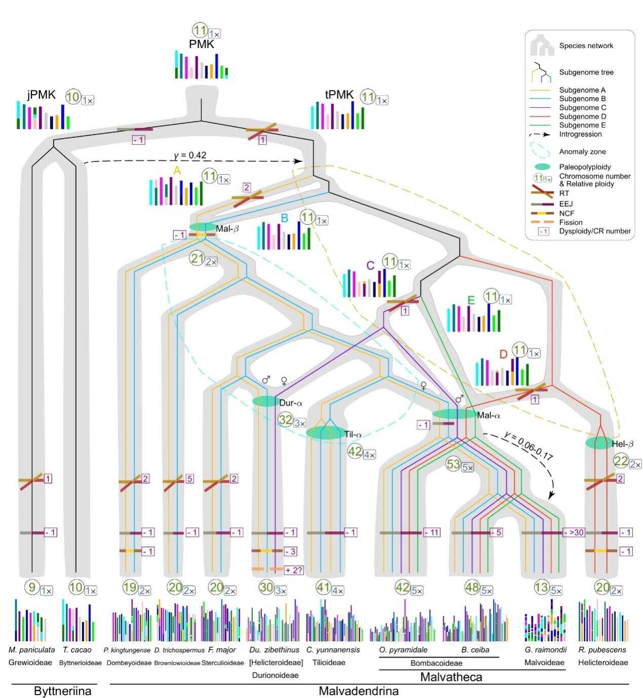 研究人员集齐了锦葵科9个亚科代表性物种的基因组数据,包括新组装的海南椴(国家二级保护植物,杯萼椴亚科)、景东翅子树(国家二级保护植物,非洲芙蓉亚科)、滇桐(国家二级保护植物,椴亚科)及梭罗树(山芝麻亚科)四个亚科的基因组,并综合运用团队前期开发的直系同源共线性检测工具和亚基因组分型方法、染色体核型演化推断及系统发育基因组学等多种方法,系统解析了锦葵科复杂的网状异源多倍体演化历史。研究表明,锦葵科早期复杂的网状异源多倍化过程快速产生了至少5个倍性不同的古老多倍体谱系。其中,Malvadendrina分支的7个亚科均经历1至2次古多倍化事件。因此,多倍体成种在Malvadendrina分支早期分化中具有重要作用。同时,研究人员通过重建祖先核型追踪锦葵科祖先多倍化和随后二倍化的演化过程发现,各亚科染色体二倍化主要由染色体端到端融合机制介导。在古十倍体雷德蒙氏棉花基因组进化过程中,发生了超30次谱系特异的端到端融合事件,且染色体数量从祖先的n=53直降到n=13。