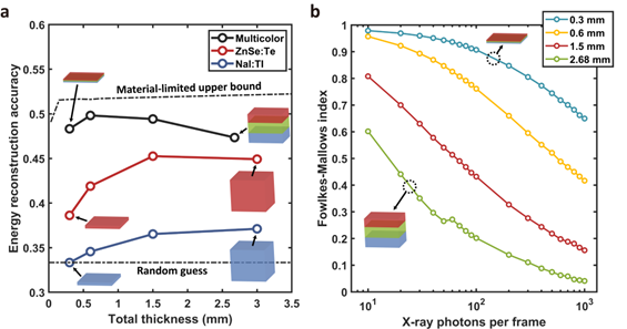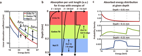 在闪烁体设计过程中,研究人员运用独特的材料选择和优化方法(如图2)。根据各层对X射线吸收和透射的不同需求,精准挑选具有特定K边缘能量和衰减系数特性的闪烁体材料。同时,优化各层厚度,在满足对不同能量X射线吸收要求的前提下,尽量减小闪烁体堆栈的整体厚度。通过这种精确的材料选择和厚度优化,解决了以往研究中难以在有限厚度内实现高效能量分辨的问题,为多层多色闪烁体的实际应用奠定了坚实基础。