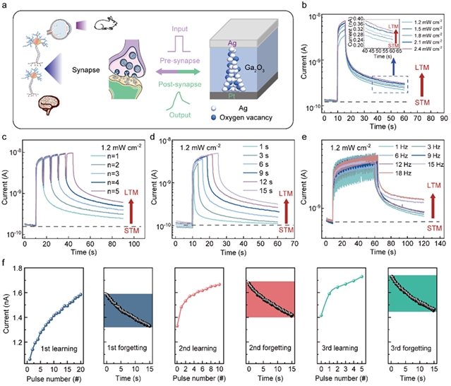 随后深入探究了氧化镓基光电忆阻器在不同光脉冲强度、数量、宽度和频率下由短时程记忆(STM)到长时程记忆(LTM)的变化情况,以及人脑学习经验行为模拟。