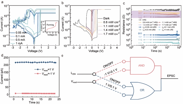 研究人员首先在不同限流下实现了易失性存储和非易失性存储共存的特性,同时在不同限流和不同光照强度的共同作用下实现了多级存储特性。之后发现不同极性电压下器件的输出电流有差异,基于负电压抑制,正电压增强的电流特性,将电压和光照作为输入,电流作为输出,实现了基本的与、或逻辑门。