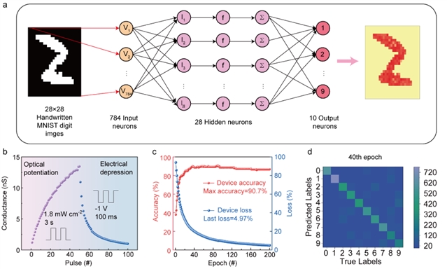 最后基于氧化镓基光电忆阻器电导的光脉冲增强和电脉冲减弱特性,构建了人工神经网络,并成功实现了90.7%手写数字识别率,为感存算一体器件奠定基础。