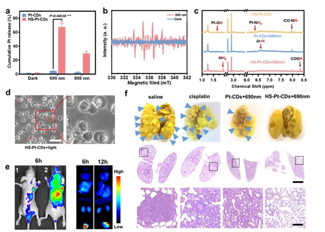 图2. 超碳点近红外光催化释放铂药、ROS及酸化,导致限制的癌细胞焦亡用于肿瘤免疫治疗。