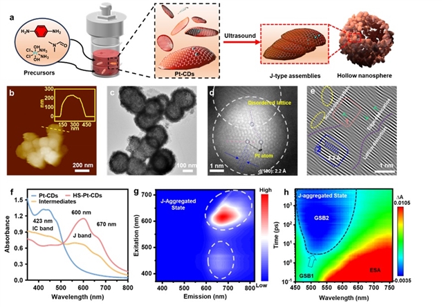 (1)缺陷驱动的结构设计:通过Pt(IV)原子在碳点sp²结构域中的配位,引发晶格畸变,形成碗状碳点(Pt-CDs)。超声处理后,这些碳点以J型滑移聚集方式自组装成直径约160 nm的中空球体(HS-Pt-CDs)。