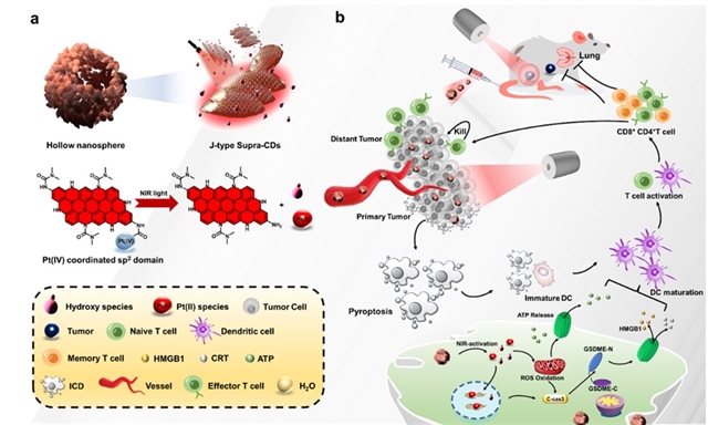 研究团队提出超分子调控策略创新设计,从分子设计到免疫激活,系统性攻克技术难题,首次通过缺陷驱动碳点以J型滑移方式组装实现分子间电荷转移,导致超过240 nm吸收光谱红移,赋予超碳点具有近红外光催化性能,实现肿瘤焦亡导致的免疫原性。