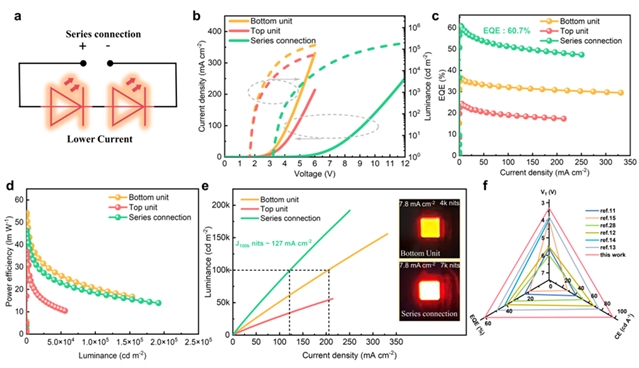 在串联工作模式下,该叠层QLED展现出几乎理想的电学特性:其启亮电压为3.3 V,正好等于上下单元启亮电压之和,说明连接层实现了优异的电气连接。在相同电流密度下,亮度显著优于常规QLED,图2f展现了本文与其他文献报道的叠层QLED的各项关键性能指标对比,该叠层QLED的EQE突破60.7%,刷新领域内已报道叠层器件的最高记录。
