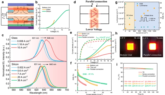 团队探究了面对面集成的叠层QLED在实现超高亮度的潜力,通过匹配具有优良导热性能的衬底(底部单元为硅衬底、顶部单元为蓝宝石衬底),可以有效地减少内部热量的积累以便器件稳定地工作在大电流密度下。同时,通过引入金属辅助电极降低电压损耗。在并联模式下,器件可工作在高达20 V的电压和35 A/cm²电流密度的条件下,最终其发光亮度突破4.8×106 cd/m²。为进一步挖掘器件潜能,使用搭建的脉冲电源进行驱动,器件在脉冲间隔期间可以更好地散热。在采用1 kHz、100 ns脉宽的脉冲驱动后,峰值电流密度进一步提升至1200 A/cm2,瞬时亮度超过1×107 cd/m²,实现1.66 J/cm2的单脉冲输出光能,具备用作高性能光泵激发源的潜力。