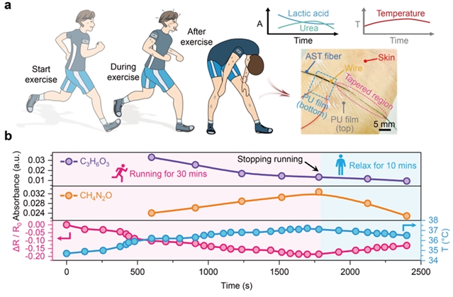 基于As3Se5Te2硫系玻璃光纤优异的红外-温度复合传感特性,进一步展示了其在人体运动过程中对体温变化及汗液代谢产物浓度的实时动态监测能力。研究揭示了这些关键生理指标与人体健康状态之间的内在关联,验证了该技术在个性化健康监测、疾病预警及精准医疗等领域的实际应用潜力。