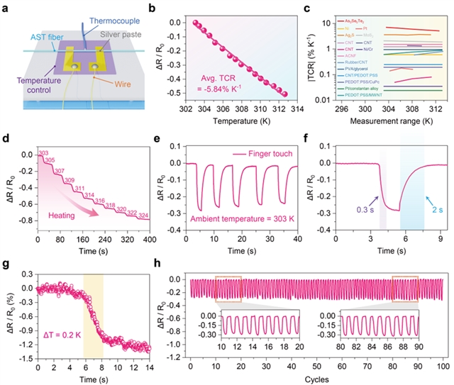 此外,得益于硫系玻璃的宽带隙特性,该光纤在人体温度范围内展现出卓越的线性度(R2>0.99)与极高的温度灵敏度(TCR=5.84% K-1),显著优于目前所报道的温度传感器。同时,该光纤还具有快的温度响应速度(~0.3 s)与出色的循环稳定性,能够精确识别低至0.2 K的微小温度变化,在人体体表温度监测方面展现出巨大优势。