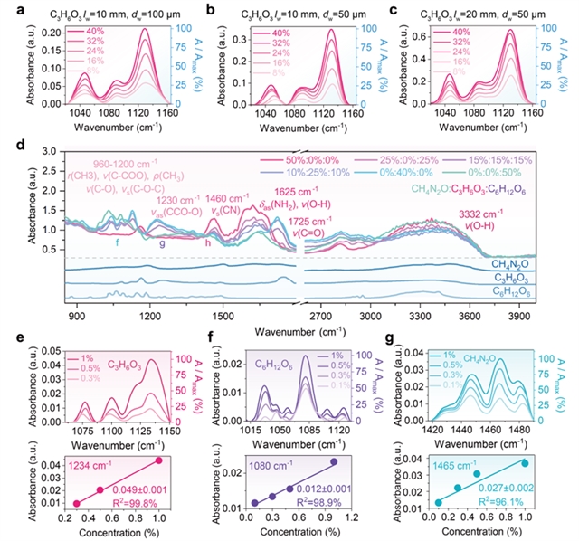 在汗液代谢产物浓度检测方面,针对多种与人体疾病密切相关的三种典型汗液代谢产物(葡萄糖、尿素及乳酸),通过对光纤锥区结构的精细优化,有效增强了倏逝场与样品分子的相互作用,实现了传感灵敏度的显著提升,成功实现了低浓度样品的精确检测。此外,通过对混合溶液光谱的解耦分析,精确识别并分离了各代谢产物在复杂汗液基质中的特征红外指纹谱,成功实现了多组分汗液的定性定量分析,有力证明了红外光纤倏逝波光谱技术在汗液检测领域的可行性与可靠性。