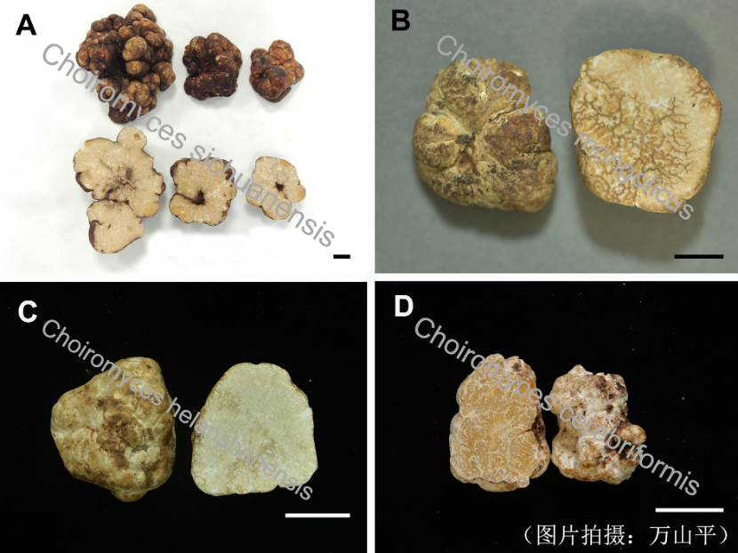 我国报道的4个猪块菌物种 (比例尺: A-D = 1 cm) 。昆明植物所供图