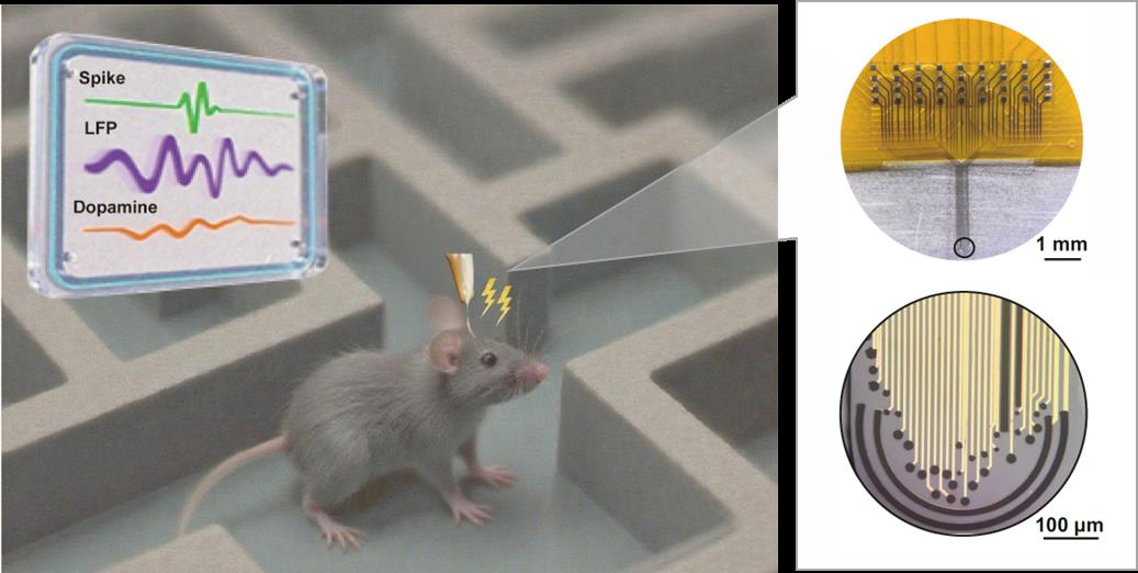 柔性脑机接口改善阿尔茨海默病认知功能方面取得新进展。阿尔茨海默病(Alzheimers disease, AD),俗称老年痴呆,是一种以记忆衰退和认知功能进行性下降为特征的神经退行性疾病。随着人口老龄化,我国AD患者预计到2050年将超过3000万例,给社会和家庭带来沉重负担。科学家发现,这种病可能与大脑中一种叫“β-淀粉样蛋白”的有害物质堆积以及大脑中多巴胺系统的失调有关。但目前医学界还没有找到完全治愈的方法。现有的无创脑部电刺激治疗虽然有一定效果,但存在两个主要难题:一是难以精准刺激到大脑深部的关键区域,二是无法实时监测脑内化学物质的变化;并且,目前缺乏能够同时实现深脑精准刺激和电-化学监测的微型化器件。
