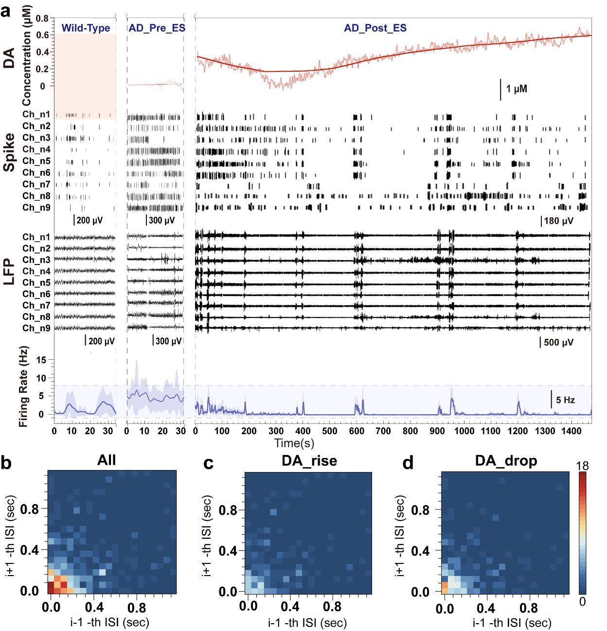 科研团队研究发现,采用NeuroRevive-FlexChip进行40Hz电刺激,会诱发海马体多巴胺水平短暂升高,并呈现刺激结束后多巴胺“回落-再上升”的短期重启现象。在重启期内,神经元放电模式从簇状放电(burst firing),转变为持续性放电(tonic firing)。最终,经过治疗的AD小鼠在Y迷宫测试中的认知能力增强;微观神经分子与细胞分析也证实该干预可有效减少Aβ42沉积,并诱导小胶质细胞形态重塑。这一创新性技术实现了电生理-电化学双模态检测与神经调控的器件集成,为AD的精准干预和治疗靶点寻找提供了技术平台。