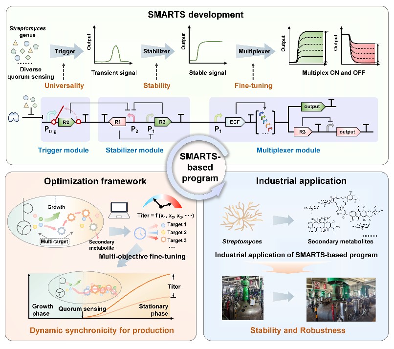 研究人员开发了一套普适性重编程工程策略,即基于对链霉菌群体感应控制系统多样性及其信号传导过程的认识,开发了普遍适用于该物种的正交、多路人工动态控制系统SMARTS。随后,研究人员利用链霉菌次级代谢共性特征,提出了一套多靶点适配原则与标准化工作流程。进一步,研究人员利用该适配原则,开发出新型抗线虫药物柏维菌素的阿维链霉菌高产菌种,并在120m3工业发酵规模下实现了高效生产。
