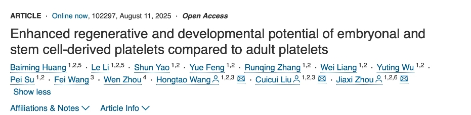 近日,中国医学科学院血液病医院(中国医学科学院血液学研究所)周家喜团队在《Cell Reports Medicine》杂志在线发表研究论文,系统解析了胚胎期及iPSC再生血小板的分子特征、功能优势及作用机理,不仅明确了这类血小板在创伤修复中的卓越性能,更鉴定出具有强大修复潜能的血小板新亚群。这些发现为推动血小板在临床多样化治疗场景中的精准应用奠定了坚实基础。