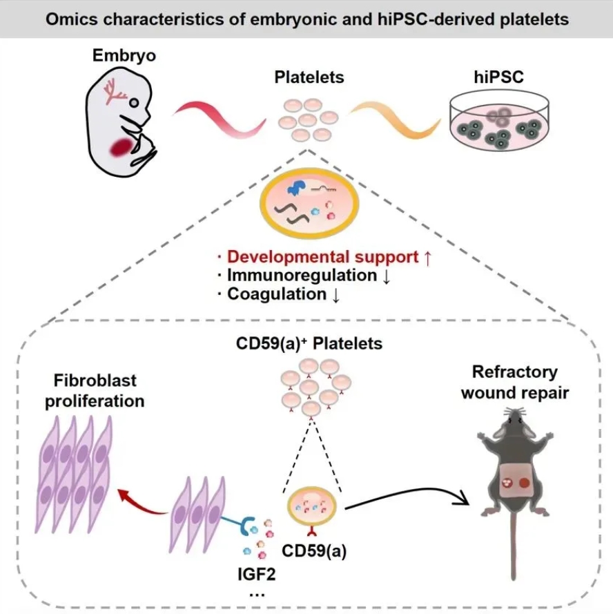 此外,团队在成人血小板中发现一群CD59阳性“类胚胎”亚群,该亚群随个体发育逐渐减少,是成年后血小板修复能力减弱的核心原因,为成年个体中富集修复型血小板用于临床精准诊疗提供理论依据。团队还证实iPSC再生血小板也具备类似胚胎期血小板的分子特征与功能优势,为突破胚胎期血小板应用限制、推动再生血小板临床转化提供重要支撑。