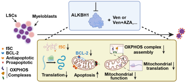 通过整合转录组测序、核糖体测序和蛋白质组测序分析,该团队鉴定出多个依赖f5C偏好密码子的翻译靶标。其中,核糖体装配因子WDR43尤为关键。ALKBH1缺失会降低WDR43表达水平,导致蛋白翻译抑制、线粒体功能受损,并下调抗凋亡蛋白BCL2的表达,从而影响AML细胞的存活能力。抑制ALKBH1或WDR43能够提高AML细胞对BCL2抑制剂venetoclax的敏感性,甚至使耐药细胞恢复敏感。