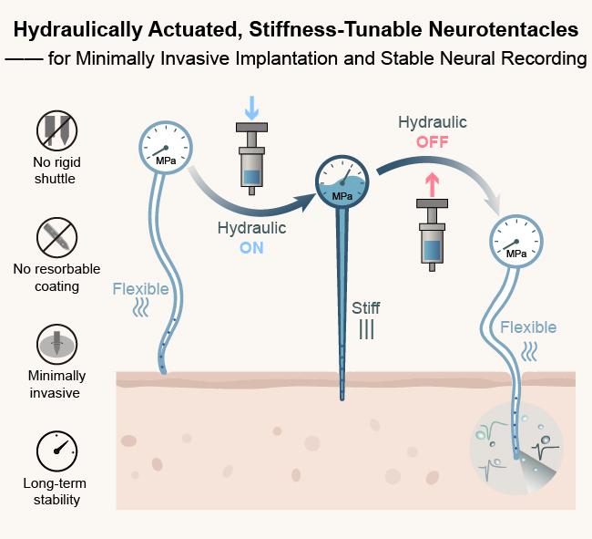 为了解决这个“植入难”问题,科研人员研发出名为“神经触手”的新型探针。这种探针里面藏着一个微小的液压系统,在植入阶段,它会像气球充气般变得足够刚硬、精准穿刺脑组织;植入到位后,它则恢复柔软状态,适应脑组织微环境。“这个巧妙的设计实现了两个关键目标:一是植入时对大脑的伤害很小,二是能长期稳定地记录高质量的神经信号。”论文共同第一作者、中国科学院半导体所王阳博士说。