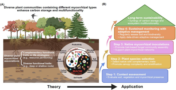研究团队整合全球森林生物多样性实验证据,论述了丛枝菌根(AM)和外生菌根(ECM)两类主要菌根真菌如何以互补方式驱动土壤碳库形成与生态功能提升。AM植物作为“深层碳工程师”,通过输入高质量的凋落物和根系分泌物,并借助其快速生长的菌丝网络,促进深层土壤中矿物结合有机质(MAOM) 的形成与稳定,对长期固碳、涵养水源和维持深层土壤肥力至关重要。ECM植物作为“表层活性管家”,产生分解缓慢的凋落物,并通过与腐生菌竞争氮源等机制,促进表层土壤中颗粒有机质(POM)积累,对维持土壤孔隙结构、活性养分供给、微生物活性和短期生产力具有关键作用。AM与ECM的互补效应并非孤立存在。在物种丰富的混交林中,两者协同作用能够同时优化土壤剖面不同深度的碳库:AM主导的深层MAOM固碳提供长期稳定性,ECM主导的浅层POM库则支撑系统活性和养分循环。这种协同作用提升了整体碳储量,还同步增强了森林的养分保持力、抗旱性、抗干扰能力及生物多样性支撑等生态系统多功能性,实现了“碳汇”与“多功能”共赢。