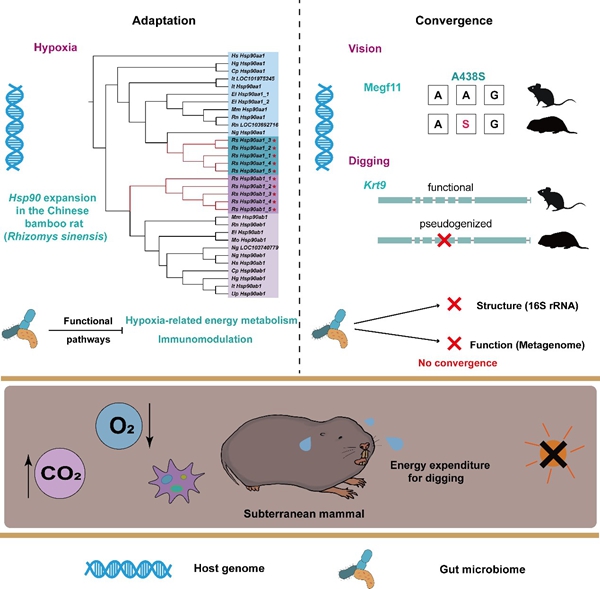 研究揭示宿主基因组趋同是地下哺乳动物适应穴居生活的趋同演化基础。趋同演化是指亲缘关系较远的物种在相似环境或生活方式下,独立演化出相似的表型或特征。地下哺乳动物独立演化出多种适应性表型和特征,以应对极端地下环境带来的低氧、黑暗等挑战,是研究特殊环境适应性演化与趋同演化的理想模型。目前,地下哺乳动物的适应性演化和趋同演化机制的研究集中在基因组层面,而转录组和肠道微生物组水平的研究相对匮乏。