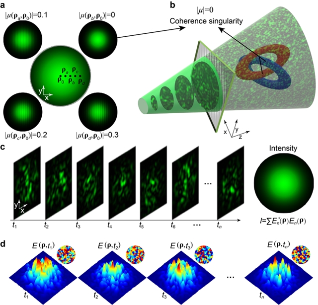 图1 展示了非相干光场中的相干奇点:随机散斑场的瞬时强度及相位分布随机,但由于统计平均效应,随机散斑构成的非相干光场强度分布趋于均匀。借助杨氏干涉表征相对参考点各点的空间相干度大小,例如选中心点为参考点,条纹清晰对应相干度较高,反之条纹对比度消失对应相干度为零,即相干奇点。由相干性调控引起的光学奇点及其对应的三维拓扑结构光场调控尚未得到系统研究。