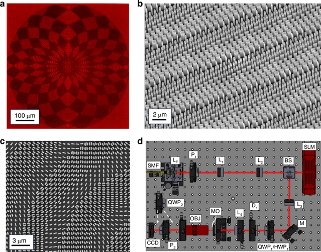 研究团队利用电子束光刻等工艺制备该超表面光学元件,图4(a-c)展示了超表面的显微镜和SEM图像,图4(d)展示了用于测试其光学性能的实验装置,包括激光光源、多种光学元件及光束收集和分析设备,用于评估超光学元件的光学性能。