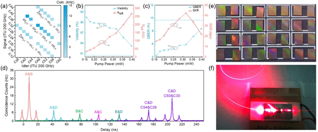 图1展示了独立双色泵浦的量子态复用量子纠缠光源的实现方案,以及10用户量子纠缠互联的拓扑结构图和波长分配方案。双色泵浦的量子态复用量子纠缠光源利用三阶非线性光学材料中的自发四波混频产生关联/纠缠光子对。当频率为ωp1和ωp2的双色泵浦光注入到非线性光学器件中,会同时发生简并和非简并自发四波混频过程。其中,频率为ω2的光子可以同时与ω1、ω3和ω4的光子间建立量子关联/纠缠关系。将不同频率的光子分配给网络中的用户,一个用户可以同时与三个用户建立量子纠缠连接,节约多用户组网所需的波长通道数。基于该方案,利用34个波长资源即可实现10用户全连接量子纠缠互联。在实验方面,研究团队利用双色泵浦激励氮化硅微环谐振腔,实现量子态复用量子纠缠光源的研制,通过使用光源输出的6个波长通道,演示了一个4用户全连接量子纠缠互联网络。进一步,基于BBM92协议分析得到该网络可进行安全密钥速率为1946.9 bps的量子安全通信。