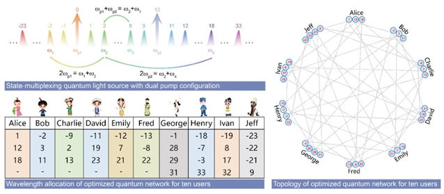 量子纠缠资源是构建量子互联网的基石,能够为端到端量子安全通信、超经典网络化量子传感、高性能分布式量子计算等颠覆应用提供重要支撑。现有多用户全连接量子互联网依赖波分组网,通过增加波长通道数来扩大用户规模,比如,10用户网络需要90个波长通道数,100用户网络需要9900个波长通道数。可见,多项式增长的波长通道资源需求,成为制约量子互联网规模化发展的天花板。在已有方案中,研究人员通过牺牲连接速率、连接时长等办法,演示了进一步扩大规模的方法。显然,这些方法难以从根本上改善量子互联网的困境。如何在有限频谱资源下实现大规模全连接量子互联网的构建,突破量子互联网的规模化发展桎梏,是量子通信技术领域的核心难题。