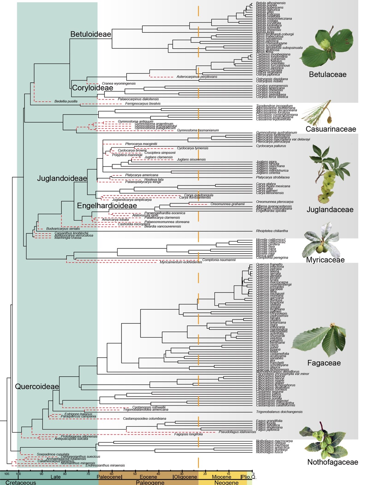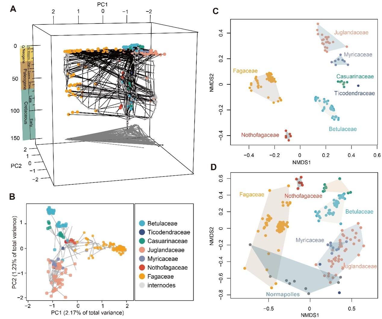 该研究利用壳斗目156个物种(新测序149个)的转录组数据和232个物种(包含52个灭绝物种)的性状数据,构建了一棵包含化石种的壳斗目植物系统发育树,进一步明确壳斗目系统发育框架,解析了桦木科、胡桃科、壳斗科内部此前存在争议的亲缘关系。研究发现,壳斗目起源于早白垩纪,干群年龄约1.085亿年,冠群年龄约1.05亿年;现存7个科的冠群分化均发生于白垩纪。研究显示,胡桃科共有一个全基因组加倍事件,以及12个壳斗目的基因加倍节点。桦木亚科、胡桃亚科的属间关系存在基因树冲突,壳斗科栎亚科系统发育中冲突显著。性状演化结果表明,早新生代时期壳斗目形态空间与现在相近,符合性状分化的“早期爆发”模式,且表型进化与基因复制事件相关,与基因冲突不相关。物种多样化与性状和基因组进化模式不相关,检测到的5个物种多样化速率变化显著节点与基因重复或性状创新无直接关联,表明植物多样性在地质时间尺度上演化的多维性。