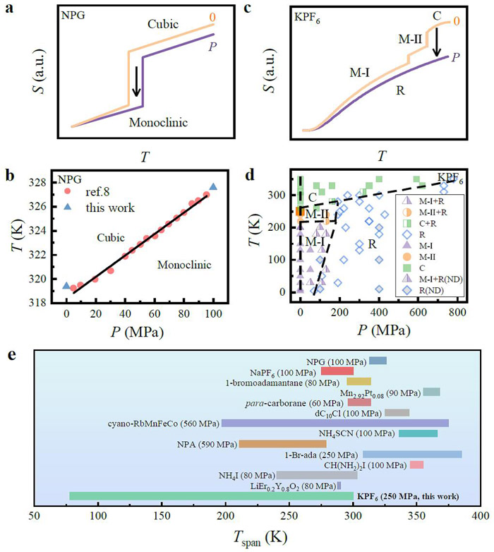 科研人员发现全温区压卡效应。由于排放和能耗问题,传统气体压缩制冷技术备受关注,学术界和工业界均在积极寻找解决方案。近年来,固态相变制冷技术经历了快速发展。该技术基于固体材料中外场诱导的各类相变,并依外场不同可分为磁卡效应、电卡效应、弹卡效应及压卡效应。在相变温度附近,外场可有效改变相变热力学势垒和能级。因此,固态相变制冷效应均出现在相变温度附近较小的范围。要实现较宽温区的连续制冷,需将多个具有不同相变温度的材料串联形成多级制冷,如室温磁卡制冷原型材料稀土钆和庞压卡制冷原型材料新戊二醇,它们的制冷温区分别在293K和315K附近约+/-10K的范围。
