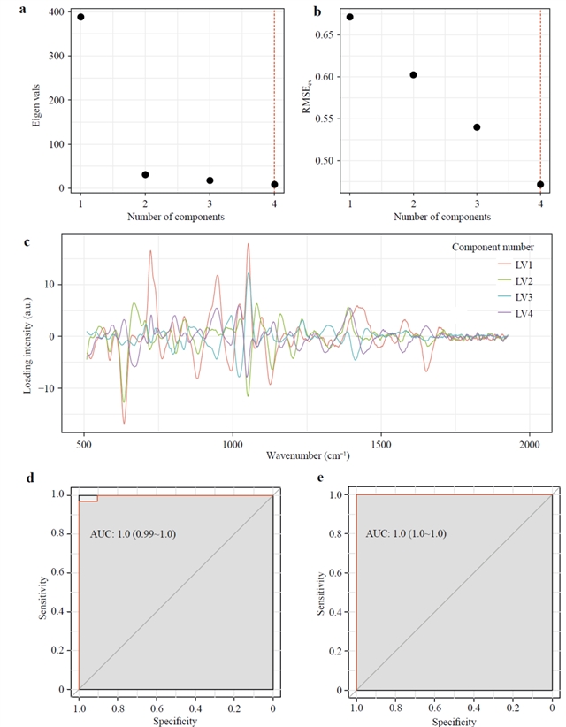 针对血清成分复杂、光谱重叠的难题,团队引入偏最小二乘判别分析(PLS-DA)算法,从517–1913 cm-1范围内筛选出三个关键特征峰:635 cm-1(尿酸)、723 cm-1(次黄嘌呤)、1052 cm-1(未知标志物)。模型通过25次迭代优化,避免过拟合。