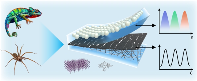 该研究报道了一种联合Marangoni自组装、等离子体刻蚀和粘性PDMS转移(MPT)的可拉伸光子晶体制备方法,构建了类似于变色龙虹彩细胞的变色结构。同时,模拟蜘蛛的裂缝器官和皮肤结构,集成了"裂纹-纤维"叠层的电阻式应变传感层,获得具有高灵敏度和宽工作范围的双功能光电子皮肤(PE-skin),该器件为可穿戴设备、健康监测和人机交互等领域带来了新的可能性。