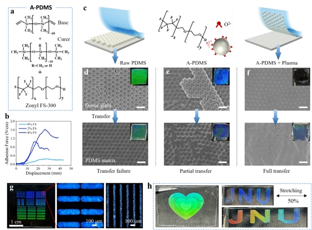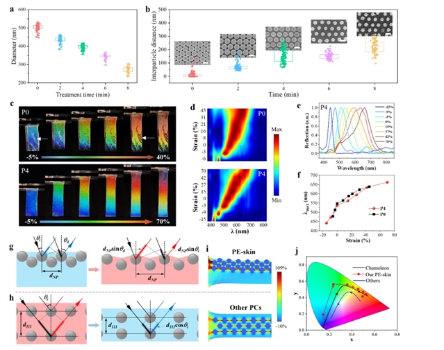 PC层的转移过程是通过将纳米粒子从玻璃基底转移到A-PDMS基底来实现的。通过等离子体刻蚀技术,研究团队能够精确控制纳米粒子的间距,从而优化PC层的光学性能。实验结果表明,经过4分钟等离子体刻蚀后,纳米粒子的直径从503.9 nm减小到271.5 nm,间距可精确调整至271.3 nm。这种调整使得PE-skin能够实现从442 nm到661 nm的宽红移响应,应变范围覆盖-15%至70%,展现出极高的力学变色灵敏度(2.57 nm/%)。