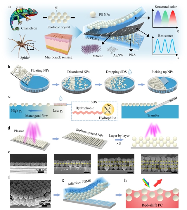 PE-skin的整体结构由光子晶体(PC)层和MXene/AgNW复合层组成。研究团队通过Marangoni自组装等离子体刻蚀和A-PDMS转移三种方法相结合,成功制备了具有平面间距和层间紧密堆积纳米粒子阵列的PC层。这种独特的结构设计使得PE-skin在平面拉伸时表现出红移力学变色响应,这在以往的拉伸响应型光子晶体中从未被报道过。此外,MXene/AgNW复合层为PE-skin提供了高电学灵敏度和良好的弹性,使其能够在大应变下稳定工作。
