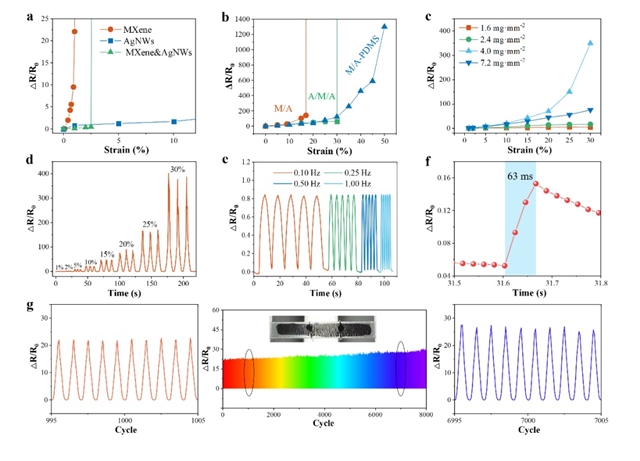 模仿皮肤多层结构,采用聚多巴胺(PDA)粘合层将脆性MXene与延展性银纳米线(AgNW)结合,构建"裂纹-纤维"叠层传感网络。MXene层形成蜘蛛腿状平行裂纹提升灵敏度,嵌入式AgNW网络耗散应变能量,使器件在50%应变下GF高达2600,响应时间快至63毫秒,经8000次循环仍保持稳定。