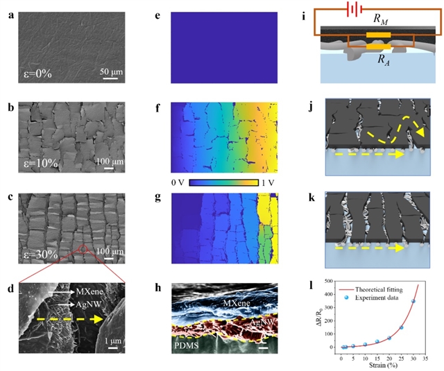 MXene/AgNW-PDMS层的传感机制基于其独特的双层结构。MXene层在拉伸时形成微裂纹,这些裂纹随着应变的增加而扩展,导致电导率的显著变化,从而实现高灵敏度的电学响应。实验结果显示,MXene层在10%应变时形成交叉微裂纹,而在更高应变(30%)时形成贯穿裂纹,显著增加了电阻变化(ΔR/R0)。AgNW网络嵌入在A-PDMS中,提供了稳定的导电路径,即使在大应变下也能保持良好的电学性能。通过调整AgNW的浓度,可以优化传感层的灵敏度,实验中发现当AgNW浓度为4.0 mg/mm²时,传感性能最佳。此外,通过模拟电势分布,研究团队验证了裂纹形成对电学响应的影响,进一步解释了MXene/AgNW-PDMS层的高灵敏度机制。