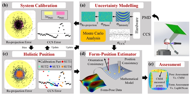 该团队突破了偏折测量技术的定位局限性,研发了一种多传感偏折测量系统,严格约束并修正偏折测量光路,并提出了一种基于贝叶斯多传感融合的形位测量算法,通过紧耦合多源观测,提高了形位偏折测量的精度与确定性,为自由曲面共体光学元件的形位一体化测量难题提供了可靠的方案。