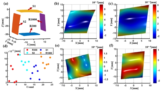 图4:四面共体元件测量误差。(a)四表面位置示意图,(b)S1表面误差,(c)S2表面误差,(d)R300球面误差(e)R1000球面误差